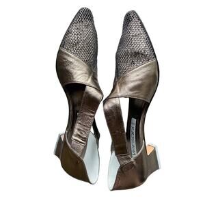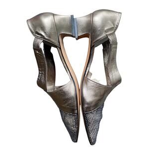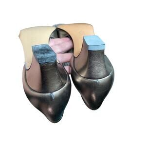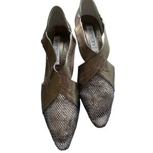 Quiet Lux Vintage VERSANI Womens Size 11 Gold Tone Pointed Toe Kitten Coquette 80s Heels. Vintage Italy made leather Kitten pumps. Perfect with crop sweaters and Jeans for a Coquette style. Pair with dress pants and soft sweaters for a Quiet Luxury aesthetic. Pair with a pencil skirt for a Retro style with tucked silk blouses. Champaign Gold with a silver mesh toe Color. Easy to stye for a minimalistic outfit letting the heels be your color. Original box with tags. Great for Theater Productions or Movie prop.