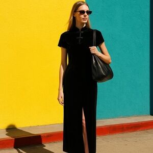 This timeless stretch velvet maxi balances elegance and edge. Features a mandarin collar with open V-neck, frog button closures, darted bust/back seams for fit, and a sassy front slit. Short sleeves + soft velvet make it breathable yet refined — equally perfect for dinner dates, company dinners, weddings, or holiday parties.
