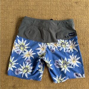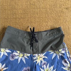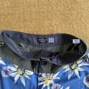 Quiksilver men’s Boardshorts in blue and green tropical print. Size 31 waist with 4 way stretch and rear pocket. Great for surfing and beach days.