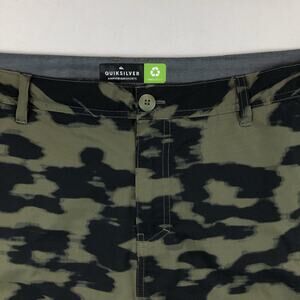 Up for sale is a used pair of Quiksilver Amphibian Mens 44 Green Camo Hybrid Street Swim Cargo Board Shorts. Shorts are in overall good condition without any stains, rips or tears. There are a few small snags by left cargo pocket.
