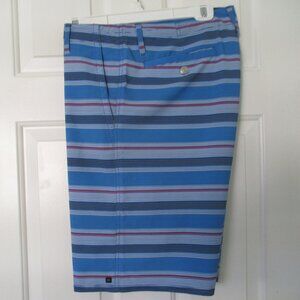 Quiksilver Amphibians Mens Blue Stretch Board Short. 4 Pockets. Belt Loops, Zipper & Snap. Size 36W, Inseam 10.5", Rise 13". 92/8% Polyester/Spandex in Blue/Red/White Stripe. Previously owned but barely used, zero sign of wear, stain or defect.