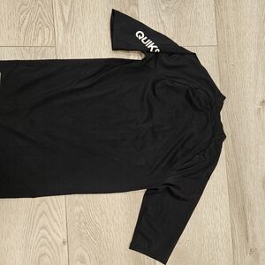 Quiksilver black rash guard with logo on chest and sleeve. Perfect for water sports.