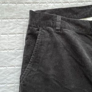 Mens black corduroy pants. Tapered fit (relaxed at hip with slim leg, not skinny). Two slant side pockets, two welt back pockets. Medium-wide cord. Wide waistband. Button closure with zipper fly, extra button included. Leather patch logo at waist.