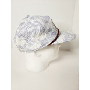 This is a stylish and versatile Quiksilver hat featuring a unique light blue and white wave pattern. The hat has a classic flat-brim design with a decorative brown rope detail across the front. The iconic Quiksilver logo is prominently displayed on a brown leather-like patch. The back features a plastic snapback closure, making it a one-size-fits-most (OSFM) item. This cap is in excellent pre-owned condition with no visible flaws. Perfect for a day at the beach, a casual outing, or as an addition to any surf and skate apparel collection.