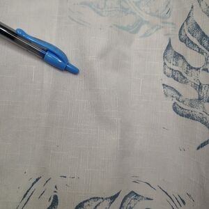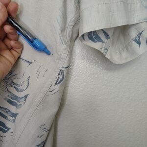 Stylish button-up shirt with a blue leaf print. Features brown buttons and a classic collar.