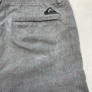 Quiksilver men’s gray chino-style walk shorts. Lightweight and casual with flat front, side pockets, button back pockets, and embroidered Quiksilver logo detail. Perfect for skate, surf, or everyday wear.