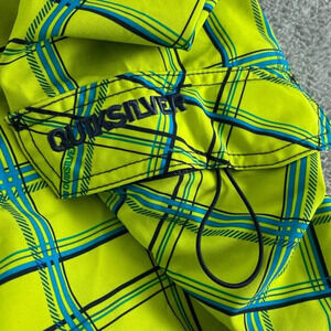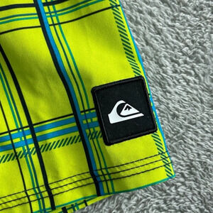 These vibrant Quiksilver swim shorts feature a stylish plaid pattern in yellow and blue. Designed for comfort and durability, they are made with a blend of polyester and spandex, offering flexibility for swimming or beach activities. The shorts come with a convenient side pocket and a drawstring closure.
