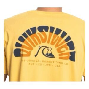 Quiksilver Moon Groove Graphic Tee in Golden Yellow Cotton Jersey Knit. It features a Great Graphic Print design on both front and back in a surf board riding culture decor. It is Short Sleeve, a Crewneck and is a Pull-Over style.