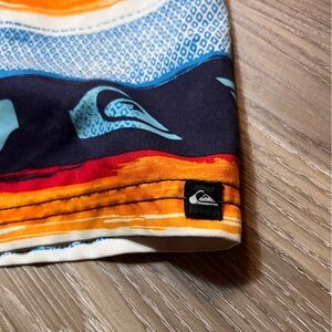 Stylish Quiksilver board shorts with vibrant stripes. Features blue, orange, and black hues.