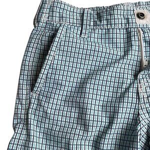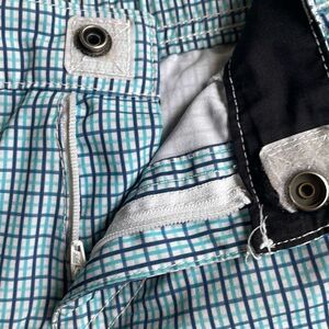 Great pair of walking shorts that doubles as swim trunks. White with light and dark blue plaid print. Side and back pockets. Snap and zipper closure. Elastic waist.