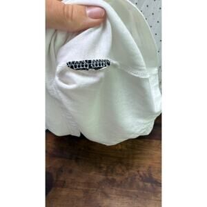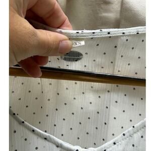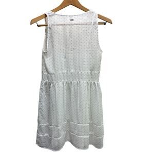 Quiksilver dress. Size XS. Black and white polka dot exterior shell which is sheer with a white slip dress underneath. The layers attach via a snap at the shoulder. The slip dress has adjustable straps. No stains or blemishes. No yellowing of the underarms. Front button accent with thin lace like strips to the outside dress . I cut the material tag for wearing but saved it as it held the extra button. Polyester/cotton blend. Please reference the photos for measurements.