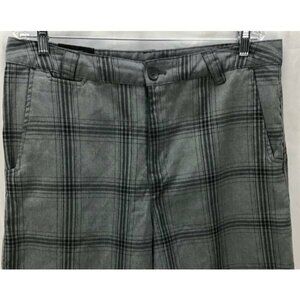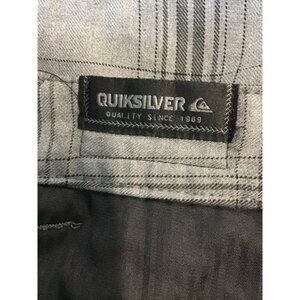 Men's size 36 shorts from QuikSilver. The shorts are in gray and black with a plaid pattern. The shorts are flat front, zipper, high rise, pockets, stretch and are in excellent pre-owned condition.