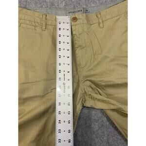 Elevate your summer style with these preowned Quiksilver shorts in tan. Made from 100% cotton, these shorts feature a solid pattern and a flat front for a sleek look. The zip closure and slash pockets make them perfect for travel or casual occasions. These preppy chinos have a regular fit and a 9.25 inch inseam. They are easy to care for and machine washable. The waist size is 36 inches and the size is 36. These shorts are perfect for any summer, fall, or spring outfit. Add them to your wardrobe today!