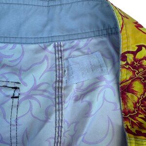 Quiksilver Sz 38 Hawaiian Swim Board Shorts with vibrant hibiscus floral pattern in yellow and orange.