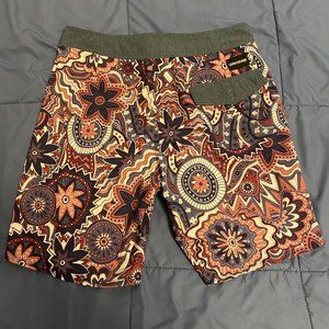 These unique patterned board shorts are made out of recycled polyester to offer incredibly lightweight and fast drying, and elastane to offer a comfortable stretch fit. No notable imperfections.