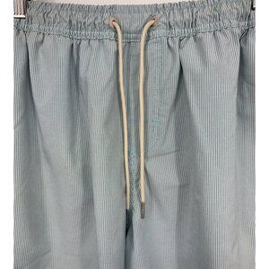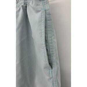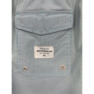 These men's light blue and white striped vintage inspired board shorts are from Quiksilver Waterman. These swim shorts features an elastic waistband, a drawstring closure, and a back pocket. This product is in excellent used condition.