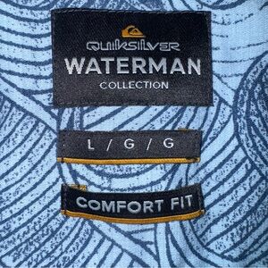 Quiksilver Waterman shirt, men’s comfort fit button up, blue wave print shirt, surf inspired casual shirt, vacation beach shirt, men’s Hawaiian style top, short sleeve Waterman shirt, large relaxed fit shirt, coastal casual wear, ocean print men’s shirt, Quiksilver surf shirt, tropical resort wear