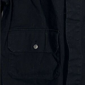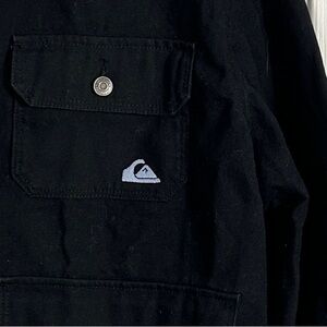 Quiksilver size large ladies jacket. Black denim with a black corduroy collar, hidden front buttons, 3 front pockets. Utility/workchore jacket style. 100% cotton. Cropped.