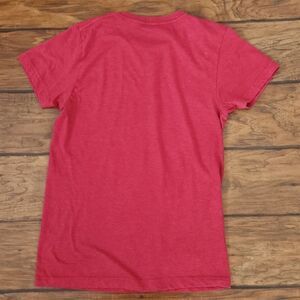 Very good pre-owned condition. Quiksilver red short sleeved t-shirt. Men's small. pit to pit measures about 19"