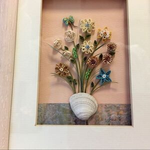 Quill Art Set Artist Signed Floral Shell Motif in Shadow Box