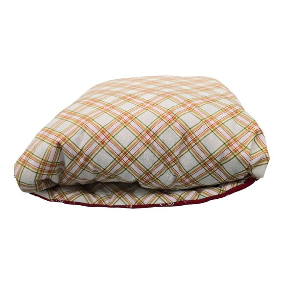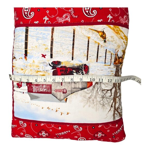 This amazing handmade Quillow is a blanket that folds into a pillow, making it an all-time favorite gift for children and adults. Great for sleepovers or lounging around the house, quillows are both functional and stylish. Handmade made from cotton/polyester blend fabrics on each side with a thick polyester batting sewn into the middle, providing warmth and durability. The product is machine washable and dryable. The open quillow measures approximately 40" W x 60" L. This features beautiful Red barn & tractor pattern on pillow. Red, yellow, green, white plaid on one side and complimenting red fabric on the other side.