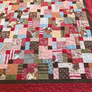 Handmade brand new Quilt, warm red dominant - think wine! In fact the back is vitner imagery and text of different wine varieties.