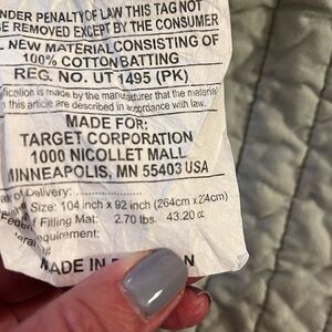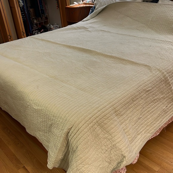 Subtle light green quilt. See tag for dimensions. I believe this would work for a king sized bed or a queen sized bed. Smoke free home.