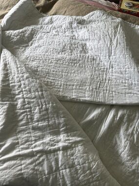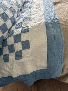 Huge blue and white checker board quilt. Handmade and no damage. Has some dust from sitting in the linen closet so could use a wash.
