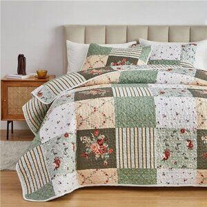 Quilt Set Full/Queen Size, 3 Pieces Green Floral Plaid Summer Bedspread