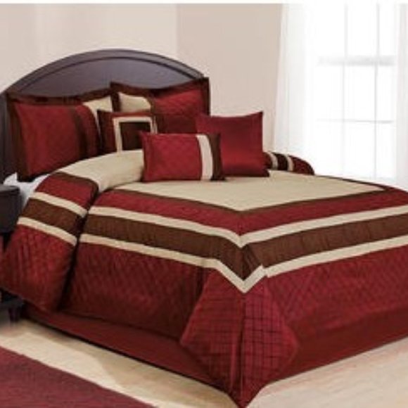 Burgundy and tan quilted bed set. Queen size. Includes comforter, 2 shams, bed skirt and 3 toss pillows.