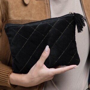 Quilted Black Velvet Clutch Pouch with Fine Thread Tassel and Zip Top Metallic
