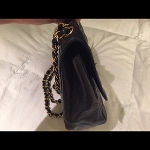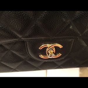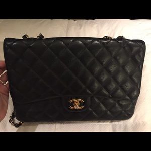 Black quilted leather Chanel Classic Jumbo Single Flap bag with gold-tone hardware, convertible chain-link and leather shoulder strap, single exterior patch pocket at back, tonal leather lining, dual interior pockets; one with zip closure and CC turn-lock closure at front flap. I purchased this at Chanel at Saks in NYC several years ago. I can get the receipt from Saks when purchased from someone at Poshmark just in case you want to get services done on it in the future.