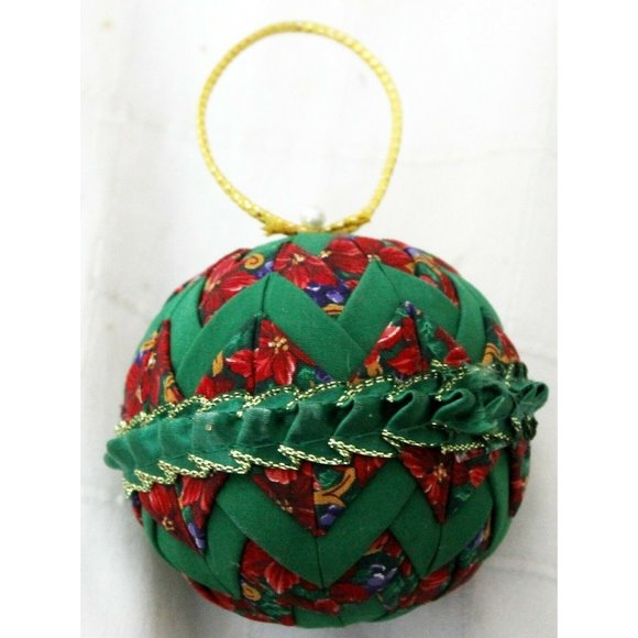 Quilted Christmas Ornament Green Red Floral Pattern Poinsettias Ribbon Decorated