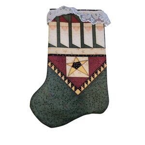 Add a touch of handmade charm to holiday decor with this quilted stocking. Patchwork design with lace trim brings warmth and nostalgia.