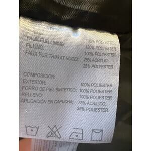 Womens' medium nice and insulated quilted coat with chunky silver tone zippers and snaps. Has hood that is faux fur trimmed and detachable by a zipper.