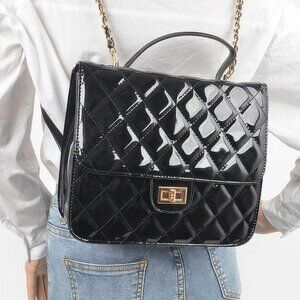 This quilted enamel backpack combines polished style with everyday functionality. Designed with a structured silhouette, it offers a refined take on a casual essential. The quilted exterior adds texture and visual interest. Compact sizing makes it ideal for carrying daily necessities without bulk. Adjustable straps provide comfortable wear throughout the day. Durable materials ensure lasting quality. A sleek backpack designed for modern lifestyles.