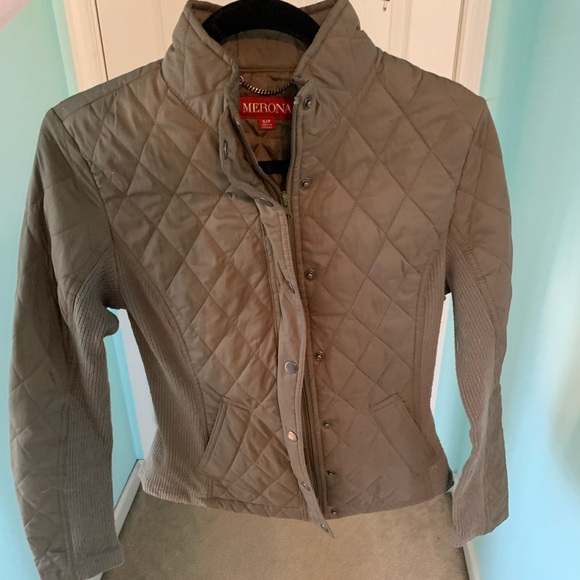 olive green quilted fall jacket with zipper and buttons, has stretchy arm and side parts