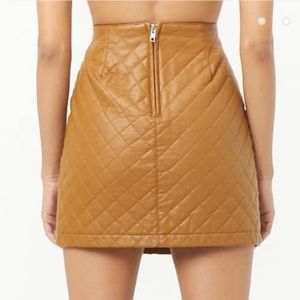 A faux leather mini skirt featuring a quilted construction, A-line silhouette, off-center front vent, and a concealed back zipper.
