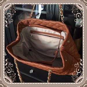Quilted camel color satchel with dual braided gold chain link carrying handles. Snap closures on each side to cinch. Tan fabric interior with three interior side pocket and two zipper pockets. Zipper pocket on reverse side. Top zip closure.