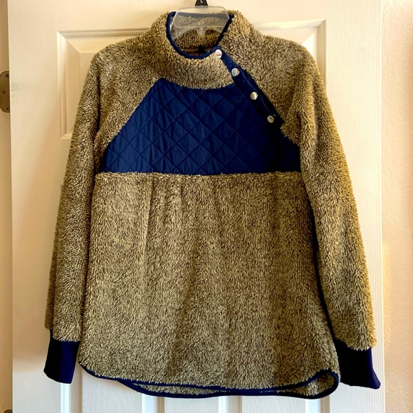 This top is amazing! I wish I knew what the brand was! Super soft, unique top with quilts and snaps. In excellent condition.