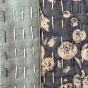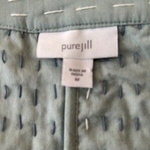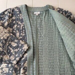 Floral pattern with contrasting liner. Size: Medium. 100% Cotton outer/polyester blend filling. Shades of light teal, slate gray and off-white floral pattern. 24" from collar to hem. 19" sleeves, can be rolled up for contrast. Two patch pockets on front. Never worn.