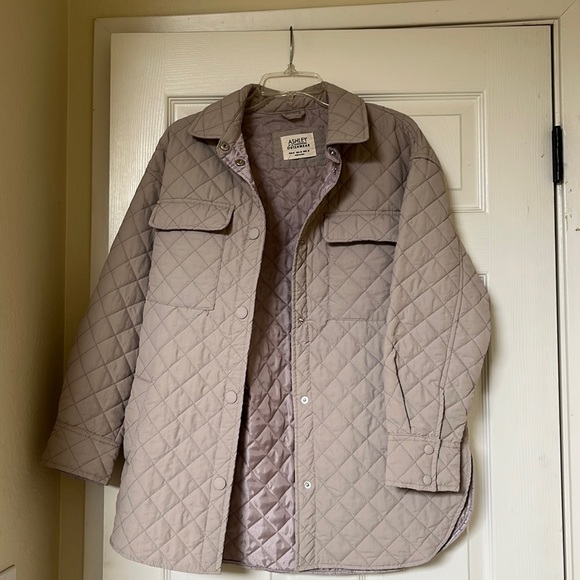 Light mauve (pinkish purple) colored quilted outerwear jacket. Size medium but fits oversized. More like a large. Bought it and only have worn it once or twice because it’s too big for me. Makes a great layering piece