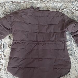 Stylish murres eggplant quilted jacket with front pockets and drawstring waist.