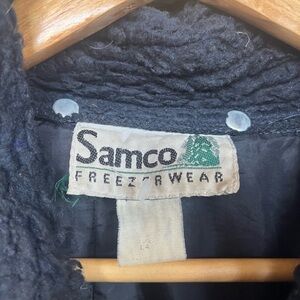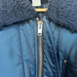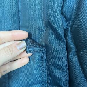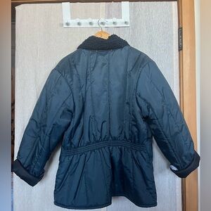 Deep teal quilted jacket. very warm. slightly cropped sleeves, elastic waistband in back. lots of pockets. some wear.