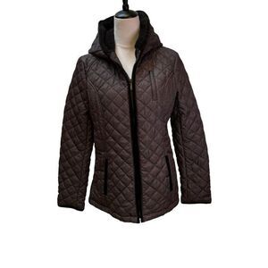 Keywords: quilted jacket, hooded coat, sherpa lined, winter jacket, fall outerwear, womens jacket, casual jacket, zippered pockets, warm coat, fashionable jacket, gray jacket, black accents, quilted design