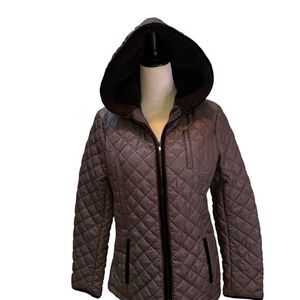 Stylish quilted jacket with a hood, offering both warmth and a fashionable look. This jacket features a quilted design throughout its exterior, adding texture and visual interest. A faux sherpa lining provides extra warmth and comfort, especially around the hood and collar. It also has a full zippered front closure for easy wear and temperature control. The jacket is designed with functional details like zippered pockets, perfect for keeping your essentials secure. It is tailored to provide a flattering silhouette while allowing freedom of movement.