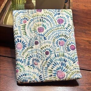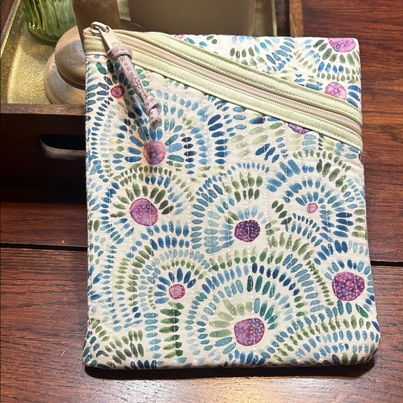 Stylish and versatile patterned zipper pouch. Features a vibrant design with blue, green, and purple accents. Perfect for protecting and storing your small tablet or reader. Measures approx 8.5”x7”