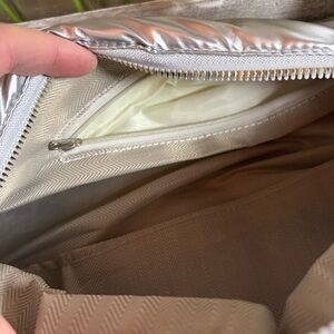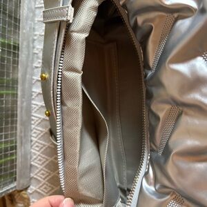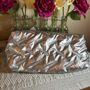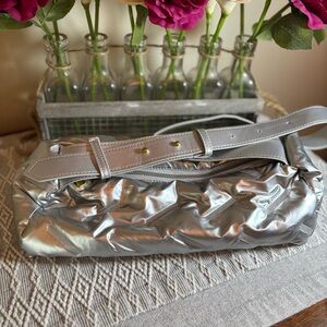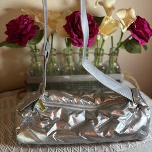 Trendy Quilted Puffer Barrel Shoulder Bag Puffy Silver with adjustable strap. Approximate measurements: 15” x 8 1/2”. Gold toned tabs on strap. One zippered inside compartment and slip pocket. Very roomy. Pre-owned, gently used.