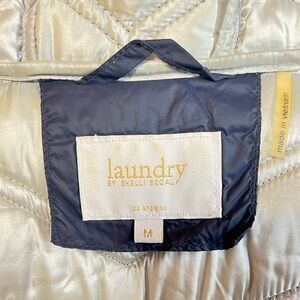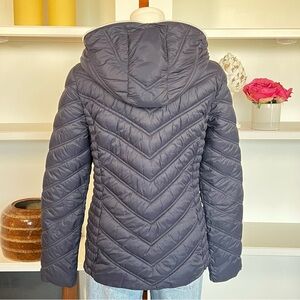 Chic quilted jacket with a hood. Features a sleek design and zippered pockets. Perfect for cool weather.
