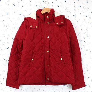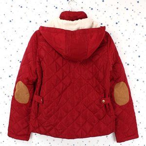 Quilted Puffer Jacket Fur Lined Hood Elbow Patch Size M Red Burgundy